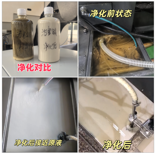 切削液为例:液品使用一段时间以后因为混入了机床的液压油、导轨油等杂油及加工渣屑,液面氧气被隔绝而产生厌氧菌,液品随之生菌发臭导致车间生产环境带有难闻的臭味,影响液品品质和机加工零件的产品质量,不得已更换液品,做危废排放处理。而我们的净化设备就是给废液除杂油、杂质、杀菌除臭让废液变成洁净如新,实现液品几何级别的循环再利用,可以为用户节约80%~90%以上的原液采购费用和危废处置费用。是纯物理的净化技术,没有任何化学添。