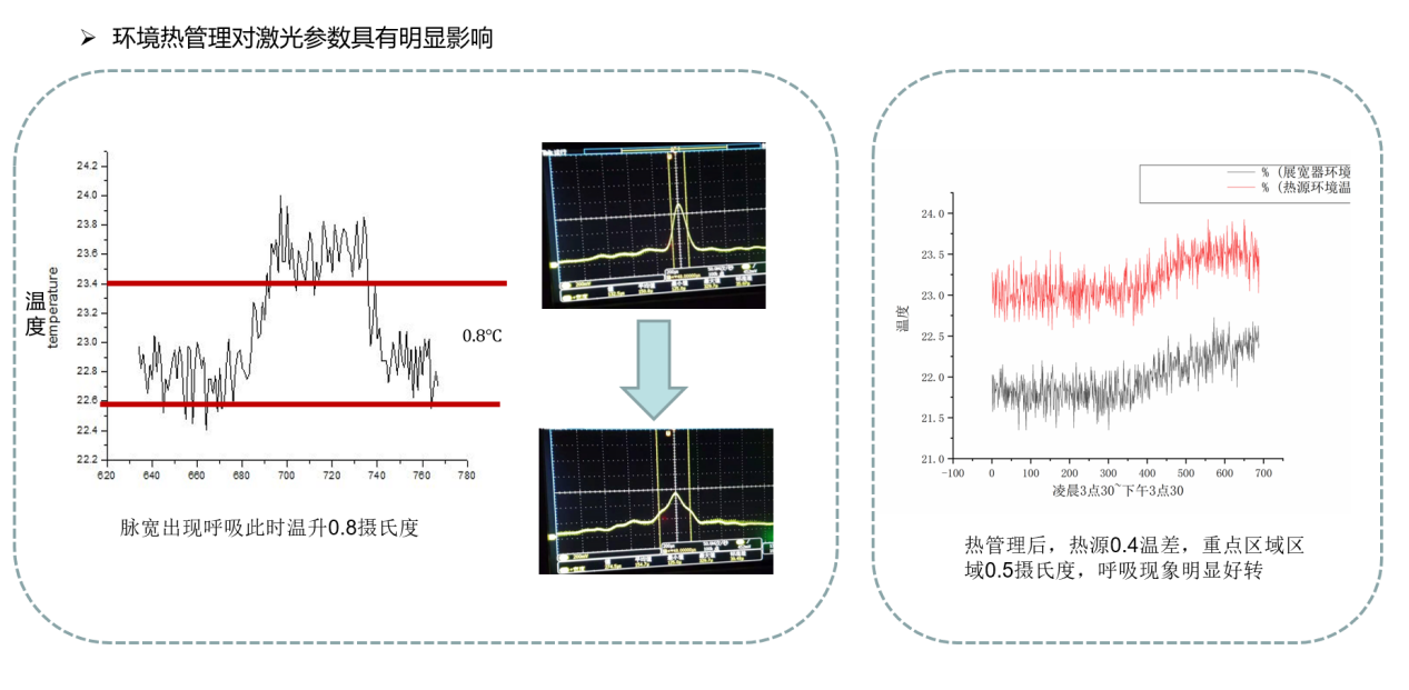 超快激光的脉宽、峰值功率等核心参数对温度极为敏感。当环境温度变化幅度超过0.8℃时,激光脉宽会出现明显的 “呼吸现象”—— 脉宽呈现无规律的周期性波动。这一现象会直接导致激光脉冲的时间分辨率下降,在半导体微纳加工中,会造成芯片电路刻蚀精度偏离设计值,引发器件性能失效。而当温度波动被严格控制在0.4~0.5℃范围内时,脉宽的 “呼吸现象” 会显著改善,激光参数的稳定性得到质的提升。因而在超快激光的应用场景中,温度控制精度直接决定了技术价值的上限。