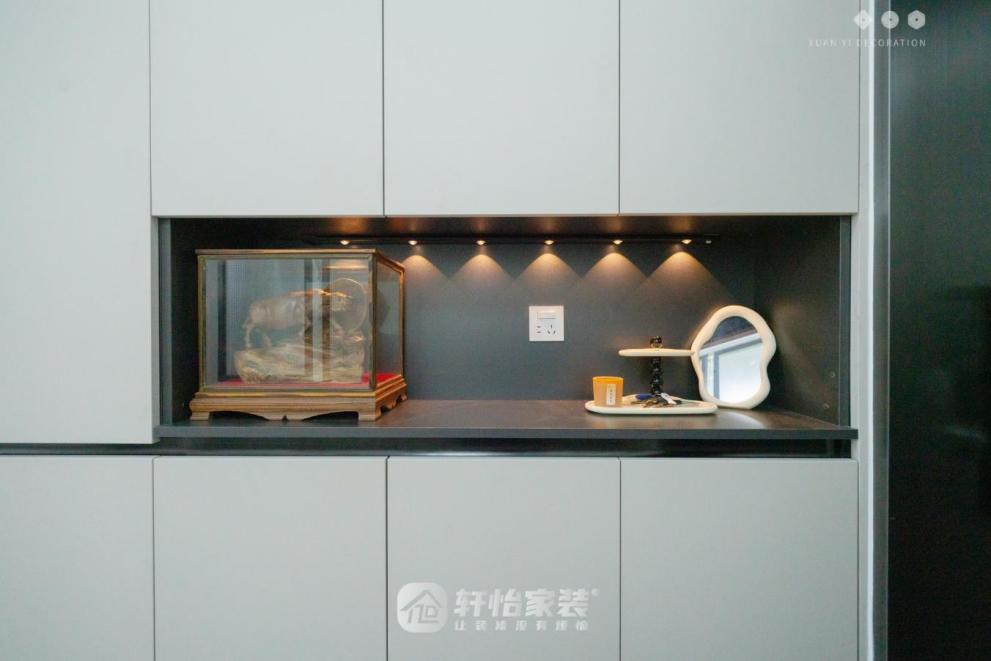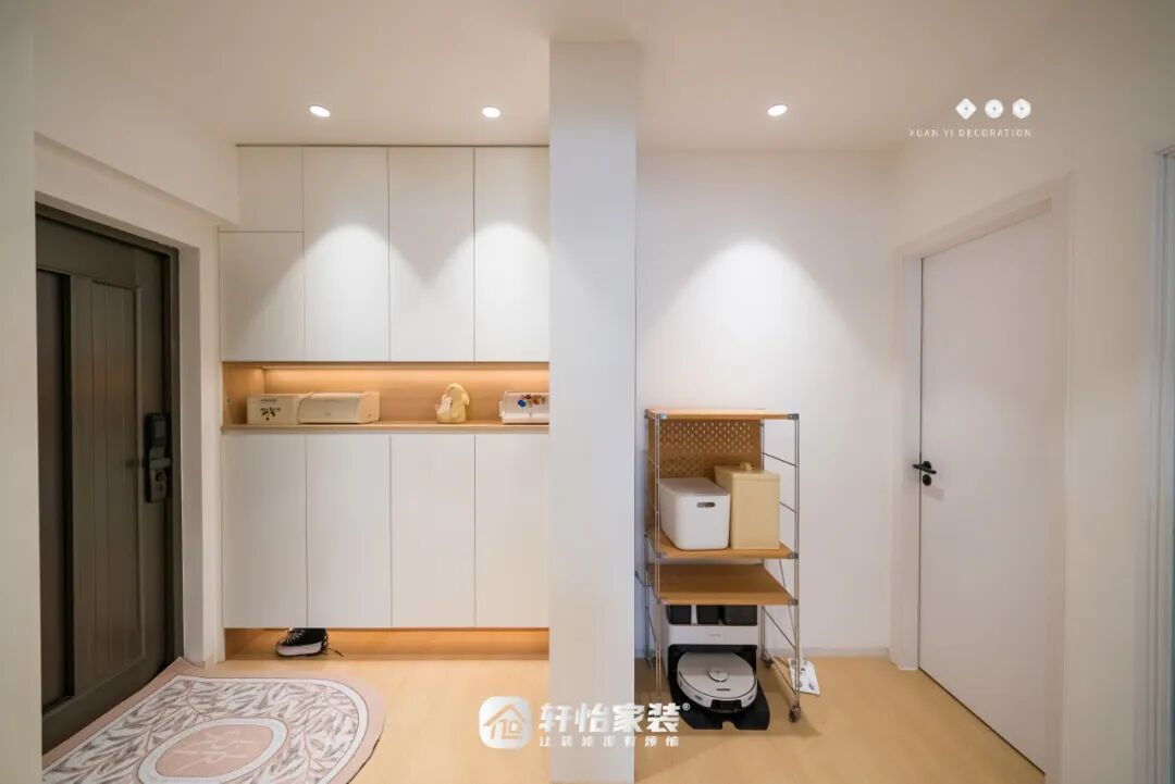 玄关是入户的第一印象。广州装修设计公司轩怡家装建议,玄关柜底部留空方便放常穿鞋,整洁美观。