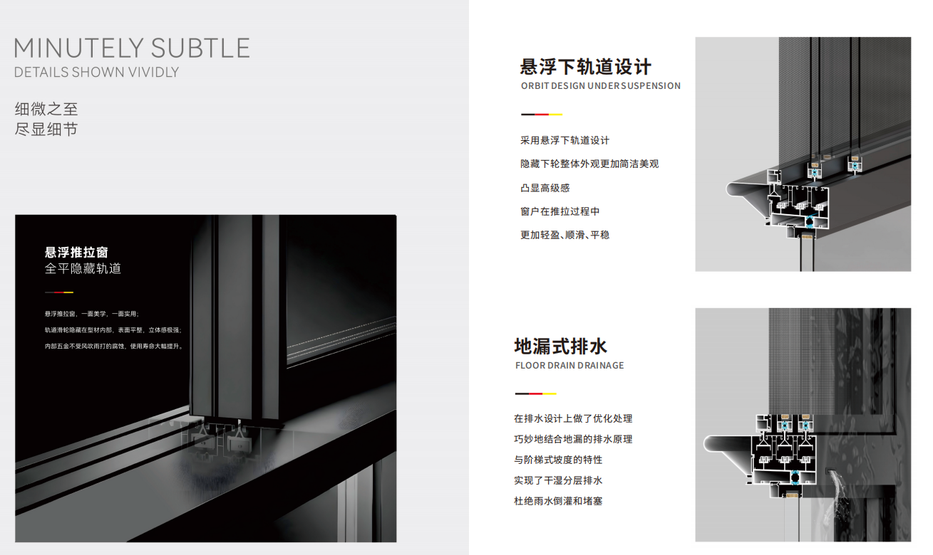 最后是精密工艺加持,筑牢静音防线。采用德式销钉双组份注胶工艺,让门窗组角严丝合缝,避免缝隙漏音;框扇齐平、内外免打胶设计,减少共振产生的噪音;地漏式排水结构不仅防倒灌,更通过优化腔体设计,降低气流噪音,从细节处提升整体静音体验。