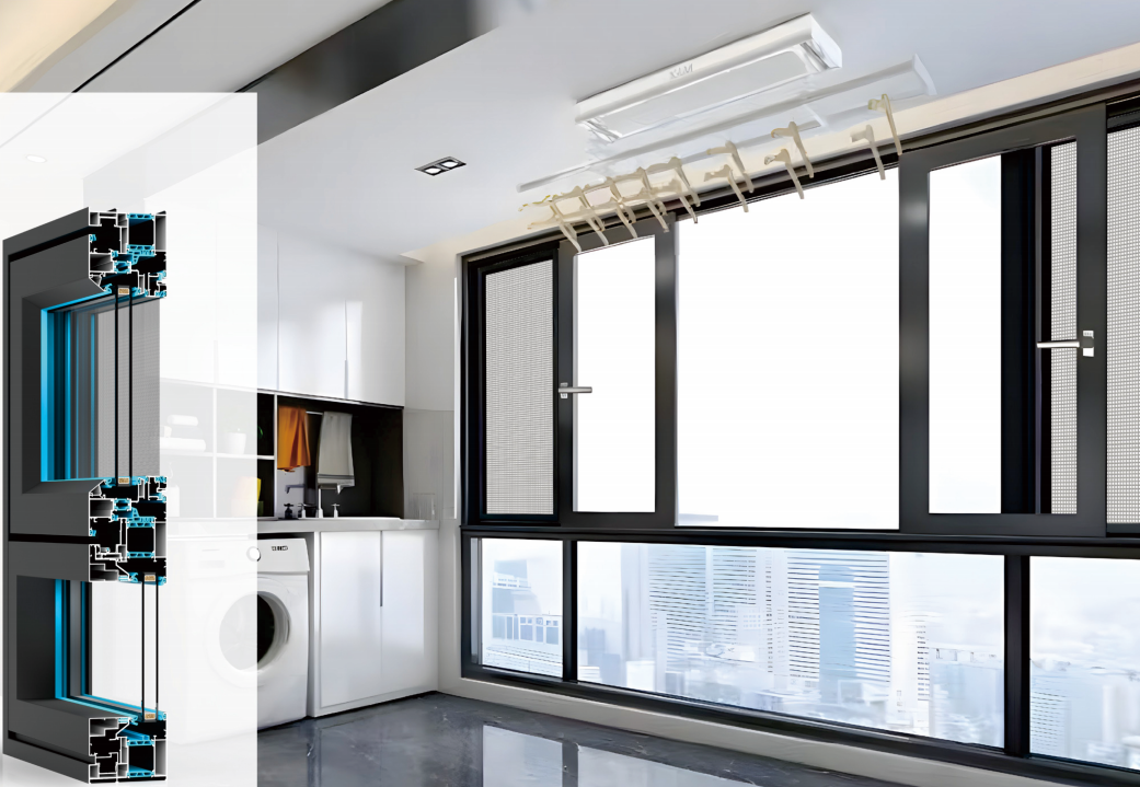 首先是多腔体断桥结构,这是静音的基础保障。旗下热门的116/120系列采用七腔体设计,101漂移窗、95双内开等系列均搭载恒温多腔体结构,通过分隔气流通道,有效阻挡声波传导,配合PA66GF25%增强尼龙隔热条,不仅实现6级隔热性能,更能大幅削弱噪音传播路径,让室内外噪音隔绝效果翻倍。