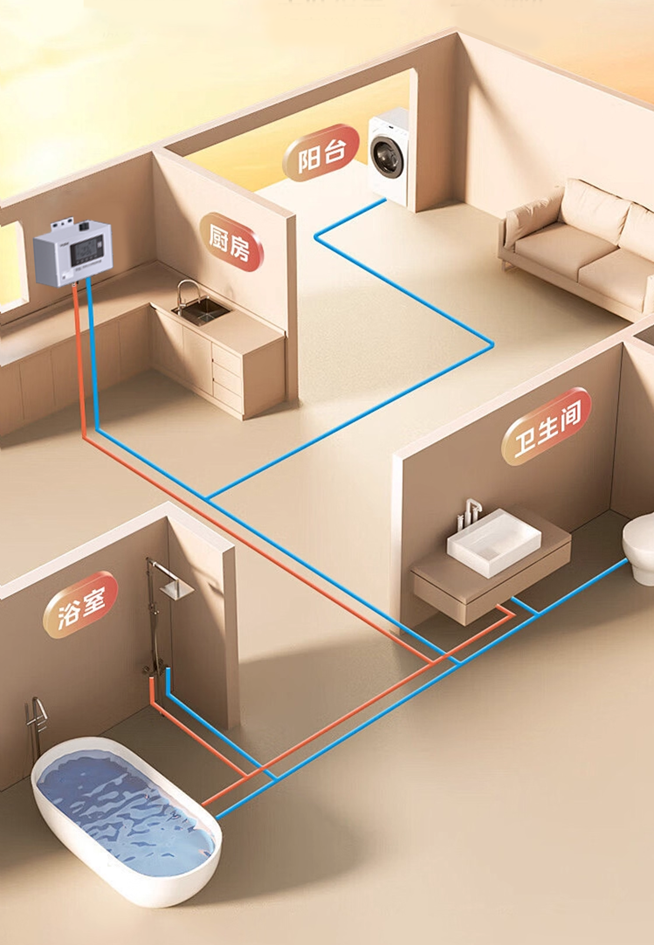 2. “房间多”导致热水“顾此失彼”大户型房间多,卫生间、厨房、阳台加起来有5-6个用水点,一旦两个用水点同时用热水(比如一楼洗碗、二楼洗澡),水管里的热水就会“分流”,远处的用水点立马变成冷水。