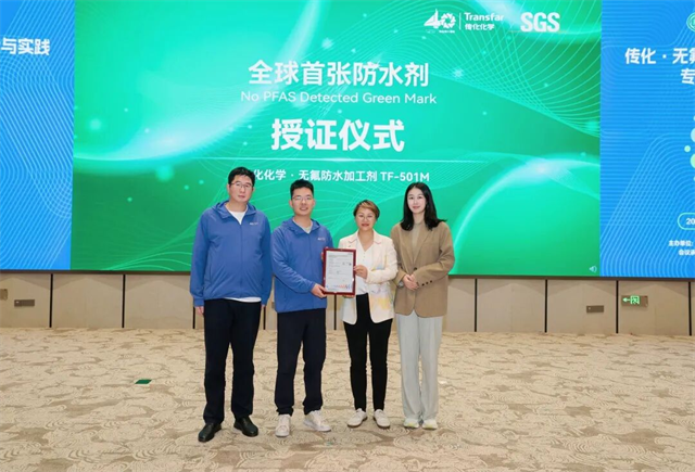 同期,传化绿色创新获全球权威认可:升级款无氟防水剂 TF-501M凭借卓越环保配方与初期5级防水,高耐水洗等性能,获颁SGS 全球首张防水剂“No PFAS Detected Green Mark”认证证书,成为全球首个获此权威认证的无氟防水剂产品,标志着传化在无氟防水技术领域迈入全球领先行列。